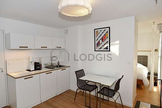 Cet appartement dispose d'une cuisine sur le séjour et tout l'équipement nécessaire pour votre quotidien : plaques de cuisson, réfrigerateur, hotte, cafetière, table à manger, placard, vaisselle, 1 chaise(s).