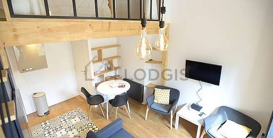 Cet appartement est composé d'un salon avec du parquet au sol et des fenêtres double vitrage. Ce salon est meublé et équipé pour rendre votre séjour agréable : télé, canapé, table à manger, bibliothèque, 1 chaise(s).