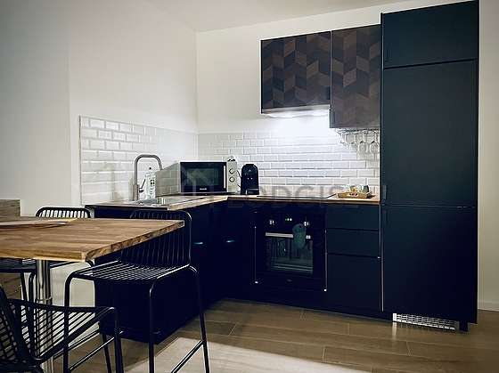 Ce duplex dispose d'une cuisine avec du parquet au sol et tout l'équipement nécessaire pour votre quotidien : plaques de cuisson, réfrigerateur, four, micro ondes, vaisselle.
