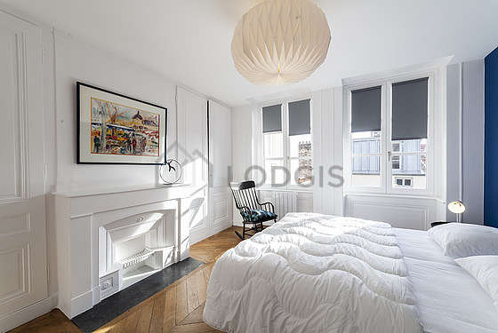 SéjourCet appartement est composé d'un salon avec du parquet au sol et des fenêtres double vitrage avec balcon et vue sur rue. Ce salon est meublé et équipé pour rendre votre séjour agréable : télé, canapé, 1 fauteuil(s), table à manger, table basse, cheminée, 1 chaise(s), lampe, meuble tv.
