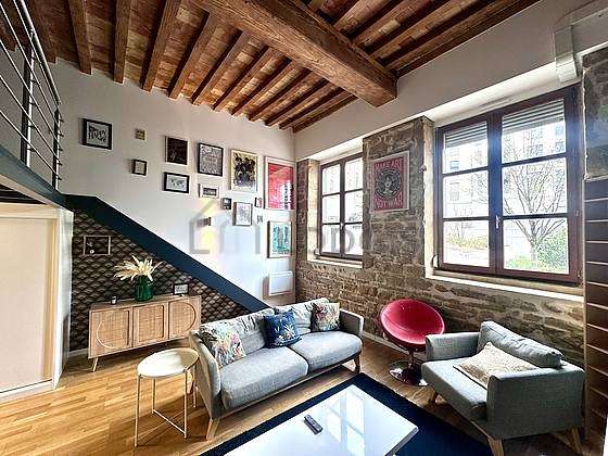 SéjourCet appartement est composé d'un salon des fenêtres double vitrage. Ce salon est meublé et équipé pour rendre votre séjour agréable : télé, canapé, table basse, penderie, placard, pierres apparentes, meuble tv, tableau.