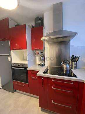 Cet appartement dispose d'une cuisine avec du carrelage au sol et tout l'équipement indispensable pour votre quotidien : four, hotte, grille pain, bouilloire électrique, table à manger, placard, vaisselle.