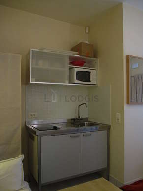Cet appartement dispose d'une belle cuisine avec du carrelage au sol et tout l'équipement indispensable pour votre quotidien : plaques de cuisson, réfrigerateur, micro ondes, freezer, bouilloire électrique, cafetière, penderie, etagère, placard, vaisselle.