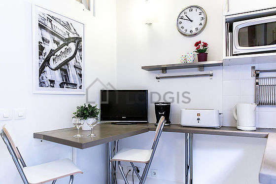 Cet appartement dispose d'une belle cuisine avec du carrelage au sol et tout l'équipement indispensable pour votre quotidien : plaques de cuisson, réfrigerateur, micro ondes, freezer, hotte, grille pain, bouilloire électrique, table à manger, etagère, placard, vaisselle, 2 chaise(s), tabouret, bar.