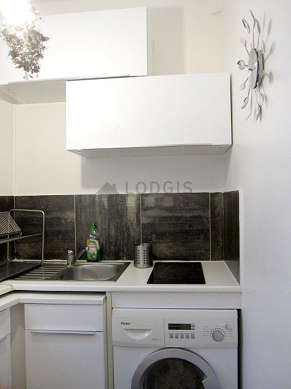 Cet appartement dispose d'une cuisine avec du carrelage au sol et tout l'équipement indispensable pour votre quotidien : plaques de cuisson, réfrigerateur, congélateur, micro ondes, grille pain, bouilloire électrique, cafetière, placard, vaisselle.