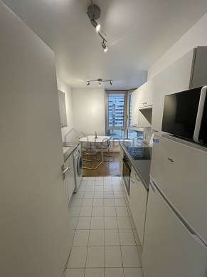 Cet appartement dispose d'une belle cuisine avec du carrelage au sol et tout l'équipement nécessaire pour votre quotidien : plaques de cuisson, réfrigerateur, congélateur, micro onde combiné, table à manger, placard, vaisselle, 4 chaise(s).