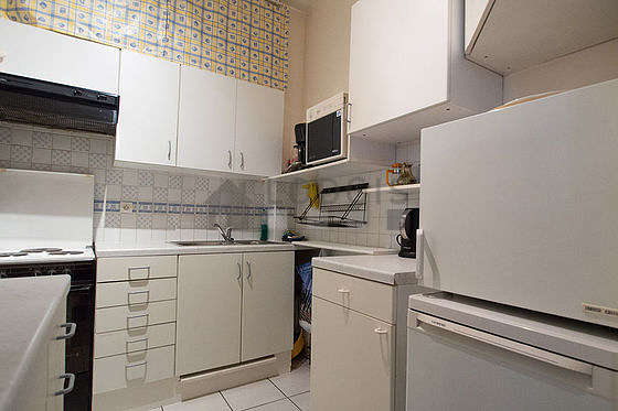Cet appartement dispose d'une cuisine avec du carrelage au sol et tout l'équipement nécessaire pour votre quotidien : plaques de cuisson, réfrigerateur, congélateur, four, micro ondes, hotte, grille pain, bouilloire électrique, cafetière, placard, vaisselle.