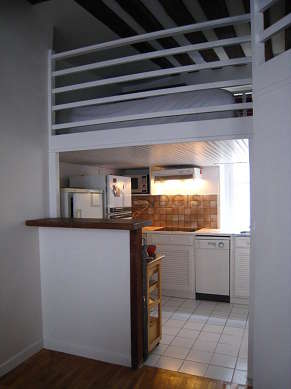 Grâce à une belle hauteur sous plafond, une belle mezzanine a pu être installée dans cet appartement , vous offrant ainsi une vraie pièce supplémentaire équipée de draps, couettes, placard, table de chevet.