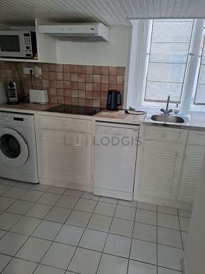 Cet appartement dispose d'une cuisine avec du carrelage au sol et tout l'équipement indispensable pour votre quotidien : télé, plaques de cuisson, réfrigerateur, congélateur, four, micro onde combiné, hotte, grille pain, bouilloire électrique, cafetière, placard, vaisselle, bar.