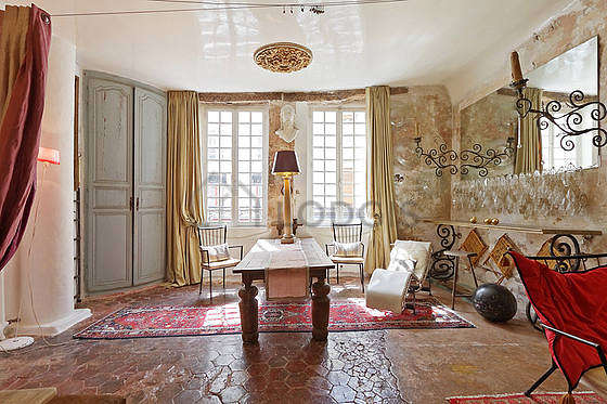 Cet appartement est composé d'un plaisant salon avec de la tomettes au sol et des fenêtres et vue sur rue. Ce salon est meublé et équipé pour rendre votre séjour agréable : draps, couettes, 3 fauteuil(s), table à manger, bureau, bibliothèque, etagère, pierres apparentes, 4 chaise(s)1 lit(s) de 130cm.