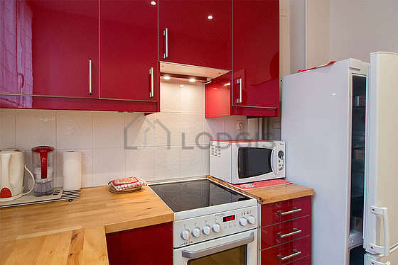 Cet appartement dispose d'une belle cuisine avec du carrelage au sol et tout l'équipement nécessaire pour votre quotidien : plaques de cuisson, réfrigerateur, congélateur, four, micro ondes, grille pain, bouilloire électrique, cafetière, table à manger, etagère, placard, vaisselle, robot ménager, tabouret.