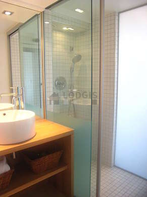 Cet appartement est équipé d'une salle de bain agréable et claire. Cette salle d'eau bénéficie du nécessaire pour votre bien-être au quotidien : serviettes de bain, etagère, douche séparée, radiateur sèche-serviettes. Les toilettes sont séparées de la salle de bain et situées dans une pièce indépendante.
