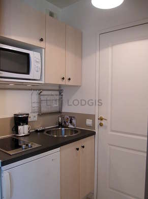 Cet appartement dispose d'une belle cuisine avec du carrelage au sol et tout l'équipement nécessaire pour votre quotidien : plaques de cuisson, réfrigerateur, micro onde combiné, freezer, grille pain, bouilloire électrique, cafetière, placard, vaisselle.