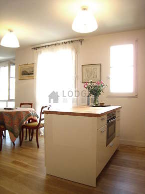 Ce loft dispose d'une magnifique cuisine avec du parquet au sol et tout l'équipement nécessaire pour votre quotidien : plaques de cuisson, réfrigerateur, micro onde combiné, freezer, hotte, grille pain, bouilloire électrique, cafetière, placard, vaisselle, robot ménager.