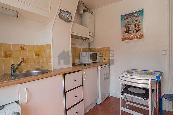 Cet appartement dispose d'une belle cuisine avec du linoleum au sol et tout l'équipement essentiel pour votre quotidien : plaques de cuisson, réfrigerateur, micro ondes, freezer, hotte, grille pain, bouilloire électrique, cafetière, table à manger, placard, vaisselle, tabouret.