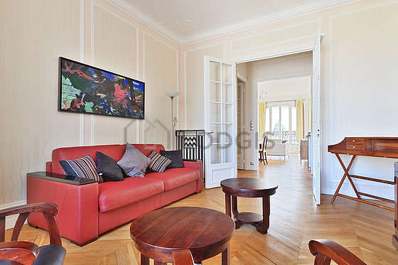 Cet appartement est composé d'un beau salon avec du parquet au sol et des fenêtres double vitrage avec balcon et vue sur rue. Ce salon très calme est meublé et équipé pour rendre votre séjour agréable : canapé, 2 fauteuil(s), table à manger, table basse, placard, 8 chaise(s).