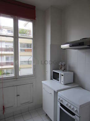 Cet appartement dispose d'une belle cuisine avec du carrelage au sol et tout l'équipement essentiel pour votre quotidien : plaques de cuisson, réfrigerateur, congélateur, four, micro ondes, hotte, grille pain, bouilloire électrique, cafetière, placard, vaisselle.