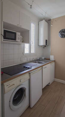 Cet appartement dispose d'une belle cuisine avec du carrelage au sol et tout l'équipement essentiel pour votre quotidien : plaques de cuisson, réfrigerateur, congélateur, micro ondes, grille pain, bouilloire électrique, cafetière, etagère, placard, vaisselle, robot ménager.