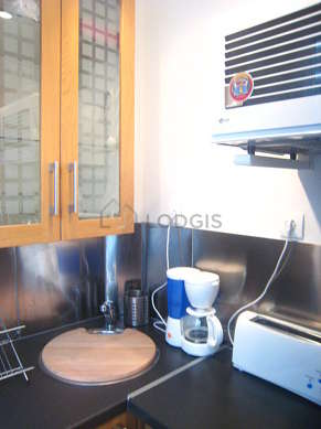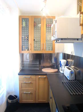 Cet appartement dispose d'une belle cuisine avec du carrelage au sol et tout l'équipement nécessaire pour votre quotidien : plaques de cuisson, réfrigerateur, micro ondes, freezer, hotte, grille pain, cafetière, placard, vaisselle.
