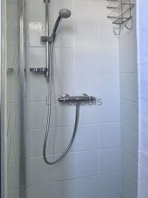 Cet appartement est équipé d'une salle de bain magnifique et très claire avec des fenêtres. Cette salle d'eau bénéficie du nécessaire pour votre bien-être au quotidien : serviettes de bain, etagère, placard, douche séparée, radiateur sèche-serviettes. Les toilettes sont séparées de la salle de bain et situées dans une pièce indépendante.