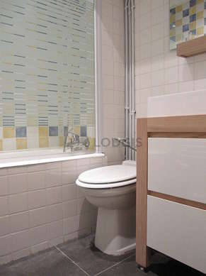 Cet appartement est équipé d'une salle de bain agréable avec des fenêtres. Cette salle d'eau bénéficie du nécessaire pour votre bien-être au quotidien : serviettes de bain, placard, baignoire, sèche cheveux, sanibroyeur, radiateur sèche-serviettes. Les toilettes sont intégrées dans la salle de bain.