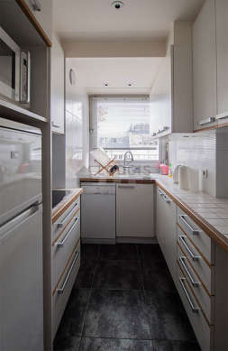Cet appartement dispose d'une magnifique cuisine avec du carrelage au sol et tout l'équipement nécessaire pour votre quotidien : plaques de cuisson, réfrigerateur, congélateur, micro onde combiné, hotte, grille pain, bouilloire électrique, cafetière, placard, vaisselle, tabouret, assiettes creuses, assiettes à dessert, assiettes plates, bol, casserole, couverts, mugs, plan de travail, poêle, poubelle, spot, verre à eau.