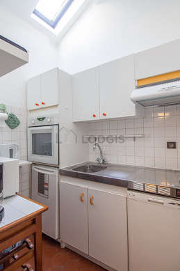 Cet appartement dispose d'une belle cuisine avec de la tomettes au sol et tout l'équipement nécessaire pour votre quotidien : plaques de cuisson, réfrigerateur, four, micro ondes, freezer, hotte, grille pain, bouilloire électrique, cafetière, etagère, placard, vaisselle.