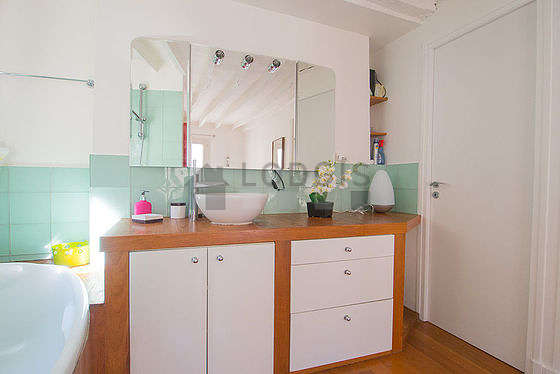 Cet appartement est équipé d'une salle de bain très claire avec des fenêtres. Cette salle d'eau bénéficie du nécessaire pour votre bien-être au quotidien : serviettes de bain, etagère, placard, baignoire, sèche cheveux. Les toilettes sont séparées de la salle de bain et situées dans une pièce indépendante.