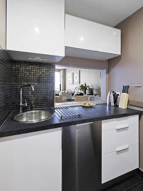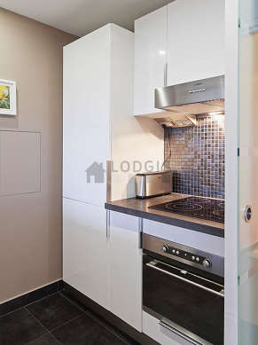Cet appartement dispose d'une magnifique cuisine avec du carrelage au sol et tout l'équipement essentiel pour votre quotidien : plaques de cuisson, réfrigerateur, congélateur, micro onde combiné, hotte, cafetière, placard, vaisselle.