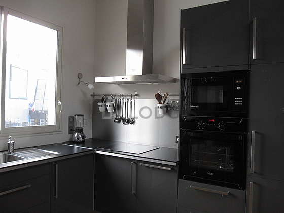 Cet appartement dispose d'une belle cuisine sur le séjour avec du parquet au sol et tout l'équipement nécessaire pour votre quotidien : plaques de cuisson, réfrigerateur, congélateur, four, micro ondes, hotte, grille pain, cafetière, etagère, placard, vaisselle, robot ménager, tabouret, bar.