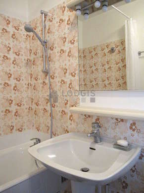 Cet appartement est équipé d'une salle de bain agréable et claire. Cette salle d'eau bénéficie du nécessaire pour votre bien-être au quotidien : serviettes de bain, etagère, placard, baignoire, sèche cheveux, radiateur sèche-serviettes. Les toilettes sont intégrées dans la salle de bain.