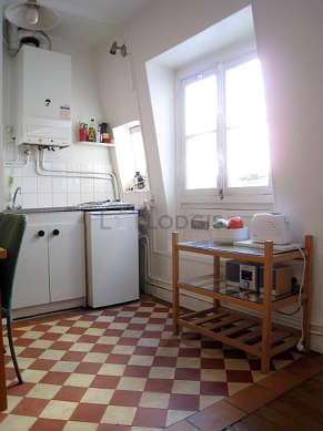 Cet appartement dispose d'une cuisine avec du carrelage au sol et tout l'équipement nécessaire pour votre quotidien : plaques de cuisson, réfrigerateur, micro ondes, freezer, grille pain, table à manger, etagère, placard, vaisselle, 4 chaise(s).
