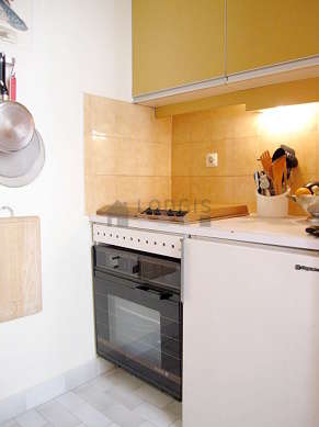 Cet appartement dispose d'une cuisine avec du carrelage au sol et tout l'équipement essentiel pour votre quotidien : plaques de cuisson, réfrigerateur, four, micro ondes, grille pain, bouilloire électrique, placard, vaisselle.