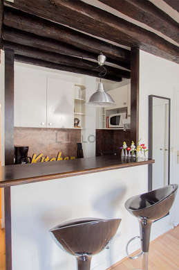 Cet appartement dispose d'une belle cuisine avec du carrelage au sol et tout l'équipement nécessaire pour votre quotidien : plaques de cuisson, réfrigerateur, micro onde combiné, bouilloire électrique, cafetière, etagère, placard, vaisselle, tabouret, bar.