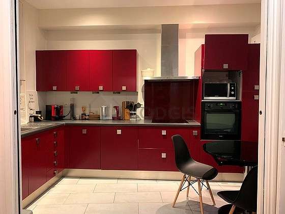Cet appartement dispose d'une magnifique cuisine avec du carrelage au sol et tout l'équipement indispensable pour votre quotidien : plaques de cuisson, réfrigerateur, congélateur, four, micro ondes, hotte, grille pain, bouilloire électrique, cafetière, table à manger, placard, vaisselle, 4 chaise(s).