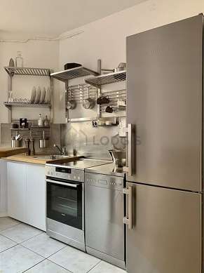 Cet appartement dispose d'une belle cuisine avec du carrelage au sol et tout l'équipement indispensable pour votre quotidien : plaques de cuisson, réfrigerateur, four, micro ondes, hotte, grille pain, bouilloire électrique, etagère, placard, vaisselle, tabouret, bar.