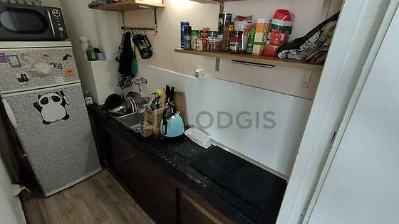 Cet appartement dispose d'une cuisine avec du parquet au sol et tout l'équipement nécessaire pour votre quotidien : plaques de cuisson, réfrigerateur, congélateur, micro ondes, bouilloire électrique, placard, vaisselle.
