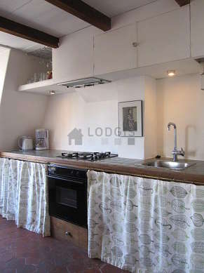 Cet appartement dispose d'une belle cuisine sur le séjour avec de la tomettes au sol et tout l'équipement nécessaire pour votre quotidien : plaques de cuisson, réfrigerateur, four, freezer, hotte, bouilloire électrique, cafetière, table à manger, placard, vaisselle, 2 chaise(s).
