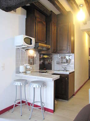 Cet appartement dispose d'une belle cuisine avec du parquet au sol et tout l'équipement essentiel pour votre quotidien : plaques de cuisson, réfrigerateur, micro ondes, freezer, hotte, bouilloire électrique, cafetière, penderie, placard, vaisselle, tabouret, bar.