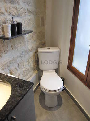 Cet appartement est équipé d'une salle de bain agréable et claire avec des fenêtres double vitrage. Cette salle d'eau bénéficie du nécessaire pour votre bien-être au quotidien : serviettes de bain, etagère, placard, douche séparée, sèche cheveux. Les toilettes sont intégrées dans la salle de bain.