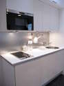 Cet appartement dispose d'une belle cuisine avec du carrelage au sol et tout l'équipement essentiel pour votre quotidien : plaques de cuisson, réfrigerateur, micro ondes, freezer, grille pain, bouilloire électrique, cafetière, placard, vaisselle, tabouret, bar.