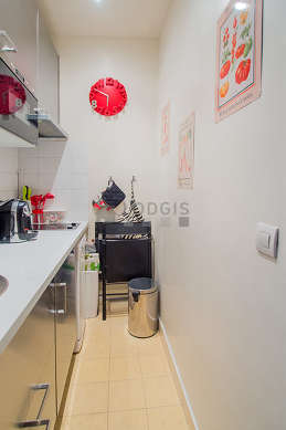 Cet appartement dispose d'une belle cuisine avec du carrelage au sol et tout l'équipement indispensable pour votre quotidien : plaques de cuisson, réfrigerateur, micro ondes, hotte, grille pain, bouilloire électrique, cafetière, etagère, vaisselle.