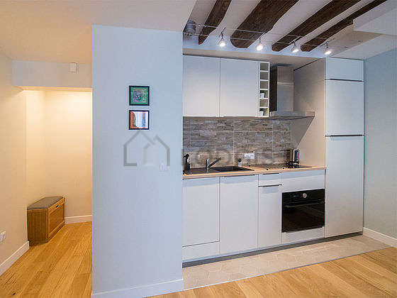 Cet appartement dispose d'une magnifique cuisine avec du carrelage au sol et tout l'équipement essentiel pour votre quotidien : plaques de cuisson, réfrigerateur, congélateur, four, hotte, grille pain, bouilloire électrique, cafetière, etagère, placard, vaisselle, poutre.