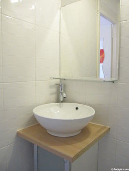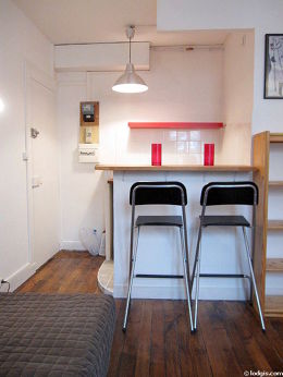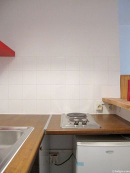Cet appartement dispose d'une cuisine avec du carrelage au sol et tout l'équipement nécessaire pour votre quotidien : plaques de cuisson, réfrigerateur, micro ondes, freezer, grille pain, bouilloire électrique, cafetière, placard, vaisselle, tabouret, bar.
