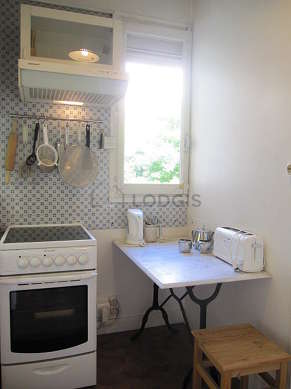 Cet appartement dispose d'une cuisine avec du carrelage au sol et tout l'équipement essentiel pour votre quotidien : plaques de cuisson, réfrigerateur, congélateur, four, micro ondes, hotte, grille pain, bouilloire électrique, table à manger, placard, vaisselle, tabouret.