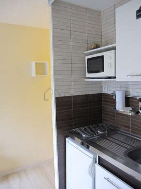 Cet appartement dispose d'une cuisine avec du parquet au sol et tout l'équipement indispensable pour votre quotidien : plaques de cuisson, réfrigerateur, micro ondes, freezer, grille pain, bouilloire électrique, cafetière, vaisselle.