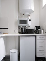 Cet appartement dispose d'une belle cuisine avec du carrelage au sol et tout l'équipement nécessaire pour votre quotidien : plaques de cuisson, réfrigerateur, micro onde combiné, freezer, grille pain, bouilloire électrique, cafetière, placard, vaisselle.
