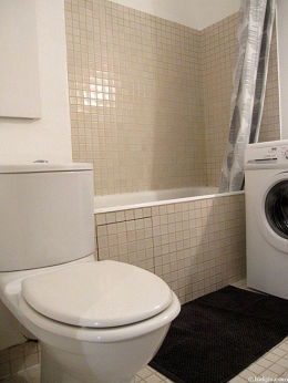Cet appartement est équipé d'une salle de bain agréable et claire. Cette salle d'eau bénéficie du nécessaire pour votre bien-être au quotidien : serviettes de bain, placard, baignoire, sèche cheveux. Les toilettes sont intégrées dans la salle de bain.