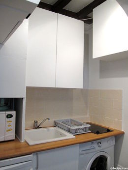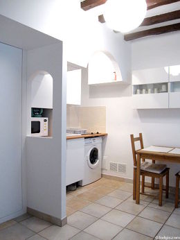 Cet appartement dispose d'une magnifique cuisine avec du carrelage au sol et tout l'équipement nécessaire pour votre quotidien : plaques de cuisson, réfrigerateur, micro ondes, bouilloire électrique, cafetière, table à manger, etagère, placard, vaisselle, 4 chaise(s).