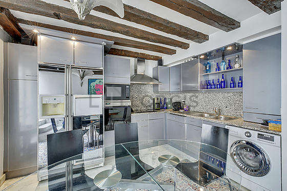 Ce duplex dispose d'une belle cuisine avec du marbre au sol et tout l'équipement indispensable pour votre quotidien : plaques de cuisson, réfrigerateur, congélateur, four, micro ondes, hotte, grille pain, bouilloire électrique, cafetière, table à manger, placard, vaisselle, 6 chaise(s).